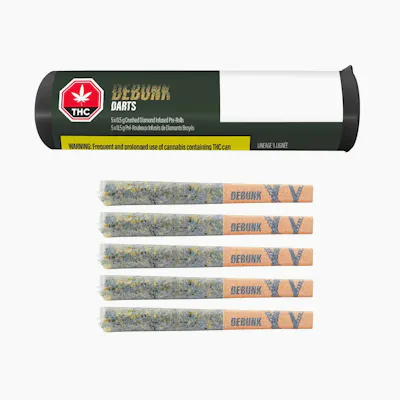 Up your game with DEBUNK Triple Infused 24K Gold Darts, a full-bodied sativa that hits different, delivering an obsessively tasty flavour profile of apricot, fruit cocktail, and deep earthy Kush. This 5-pack of darts are Bubble Hash coated and infused with THCa isolate, hydrocarbon extracted distillate, and botanical terpenes for maximum flavour and potency. With high-quality milled flower in a classic 0.5 g format, this cross between Kosher Kush and Tangie comes in at 40% THC, delivering a pack of bold, premium pre-rolls built to hit harder.
