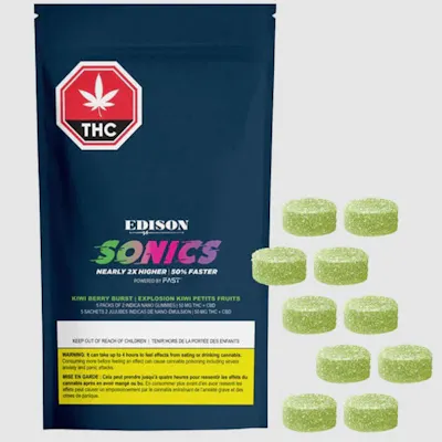 This multipack contains 5 immediate containers, each with 2 soft chews -for a total of 10 soft chews.SONICS Kiwi Berry Burst multi-pack sativa gummies - powered by FAST, proprietary nano-emulsion technology - deliver peak cannabinoid levels that are nearly 2x higher with a 50% faster onset. Each pack has 5 pouches inside; with 10 mg THC + 10 mg CBD split between 2 gummies; and a total of 50MG THC & 50MG CBD PER PACK. Delight in the lush flavours of strawberry, kiwi, and passionfruit with these rapid onset gummies.