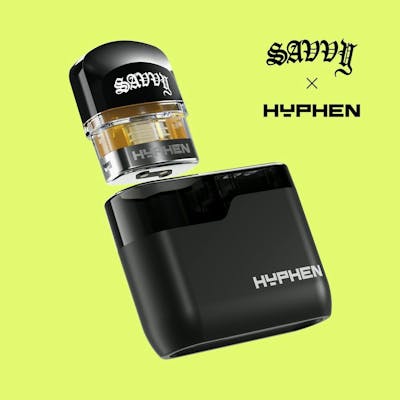 The Savvy Hyphen AIO 2g Peaches and Cream is a cannabis all-in-one vaporizer containing 2 grams of Peaches and Cream oil, a classic hybrid strain known for its balanced, euphoric, and creative effects. Hyphen is a Savvy brand product line that uses a modular battery and pods.
