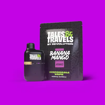 Going bananas? Mango with the flow! Banana Mango is a tropically tranquil hybrid that produces a balanced bliss while shipping you off to pure paradise. 🥠-- Tales & Travels disposables pack juicy flavors into a small-but-mighty package that won't ghost on your good time (hello, rechargeability! 👋). Snagging solid ingredients from our big sis at Revolution, these flavor-fuzed puffs come with the family discount so you can save that cash for snacks. Big taste, bigger vibes, baby price tag! 💸 -- Tales & Travels is the spunky little sibling of the award-winning Revolution Cannabis. We're affordable, full of character(s), and know how to blend our big sister's expertise into a fun mix of THC goodies - perfect for everyone from the canna-curious to the canna-chronic. -- WEED got something for everyone. -- revcanna.com