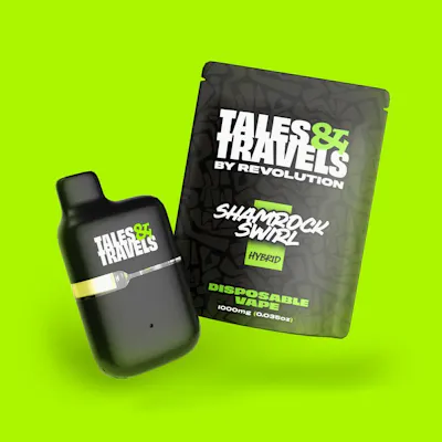 "Strike gold with every puff! Shamrock Swirl is a cool, creamy hybrid serving up good fortune with minty sweetness and a magical buzz. š Tales & Travels disposables pack juicy flavors into a small-but-mighty package that won't ghost on your good time (hello, rechargeability! š). Snagging solid ingredients from our big sis at Revolution, these flavor-fuzed puffs come with the family discount so you can save that cash for snacks. Big taste, bigger vibes, baby price tag! šø Tales & Travels is the spunky little sibling of the award-winning Revolution Cannabis. We're affordable, full of character(s), and know how to blend our big sister's expertise into a fun mix of THC goodies - perfect for everyone from the canna-curious to the canna-chronic. WEED got something for everyone. revcanna.com" -- Tales & Travels disposables pack juicy flavors into a small-but-mighty package that won't ghost on your good time (hello, rechargeability! š). Snagging solid ingredients from our big sis at Revolution, these flavor-fuzed puffs come with the family discount so you can save that cash for snacks. Big taste, bigger vibes, baby price tag! šø -- Tales & Travels is the spunky little sibling of the award-winning Revolution Cannabis. We're affordable, full of character(s), and know how to blend our big sister's expertise into a fun mix of THC goodies - perfect for everyone from the canna-curious to the canna-chronic. -- WEED got something for everyone. -- revcanna.com