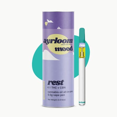 75% THC4:1 THC / CBN---rest easy with this harmonious blend of earthy + floral aromatic notes. enjoy the natural grounding qualities to help you find peaceful calm + a sense of serenity. ayrloom mood's rest vape may promote a feeling of stress-relief and well-being. 0.5 Gram Per Unit