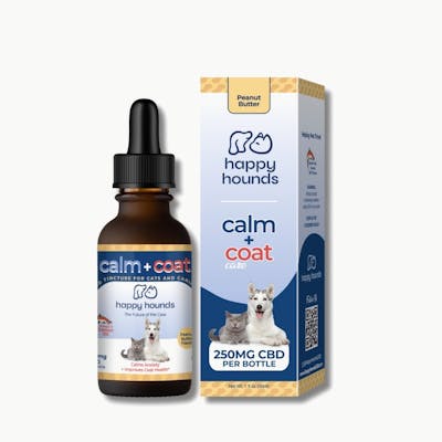 Calm + Coat Salmon Oil CBD Drops for Pets (250mg) Happy Hounds Calm + Coat Drops are the best calming drops for dogs designed to soothe stress, reduce anxiety, and improve skin & coat health. Made for both dogs and cats, with Salmon Oil, Turmeric, and full-spectrum hemp to provide natural stress-relief and help to hydrate your pet's skin and coats from the inside out.