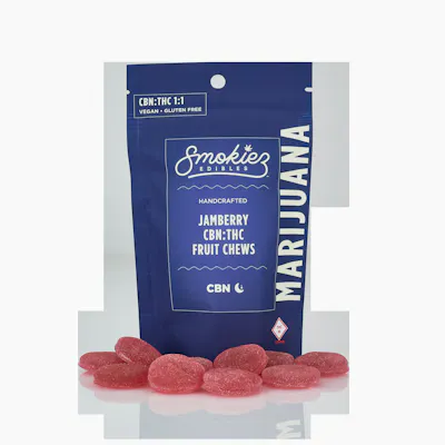 NEW! Smokiez™ Relaxing Jamberry CBN:THC 1:1 Fruit Chews are NOT YOUR AVERAGE GUMMY™ ;) These delicious fruit chews are a tasty and satisfying way for you to medicate. They are also Vegan, Gluten-Free, Dairy-Free, and contain NO High Fructose Corn Syrup. Each of our mouth-watering fruit chews contains 10 mg of CBN and 10 mg of THC and made with our high clarity hemp extract for great taste. There are 10 pieces per package with a total of 100 mg active CBN and 100mg of active THC per package. SO... WHAT IS CBN? Cannabinol (CBN) is a mildly psychoactive compound in marijuana and is unique to the plant. According to Steep Hill Labs, Cannabinol is the most sedative known cannabinoid, which makes it an ideal cannabinoid for a solid night of sleep.