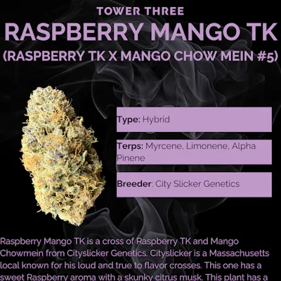 Raspberry Mango TK is a cross of Raspberry TK and Mango Chowmein from Cityslicker Genetics. Cityslicker is a Massachusetts local known for his loud and true to flavor crosses. This one has a sweet Raspberry aroma with a skunky citrus musk. This plant has a very distinct profile and a well suited name, making it particularly well received. Her flowers are large spears with mixed purpling and streaks of silver.