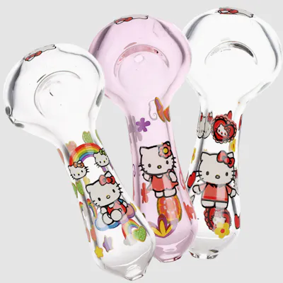 Highlights 3-count bundle 4.5 inches long Spoon style hand pipe Cute Kitties pattern decal design Glow in the dark accents Borosilicate glass Assorted colors & designs The Cute Kitties Glass Spoon Pipe is made with borosilicate glass and decorated with decal designs depicting a pattern of Kitty with rainbows, flowers, or hearts with glow in the dark accents. Measures 4.5 inches (11.4cm) tall.