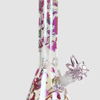 Highlights 9.75 inches tall Beaker style water pipe Party Kitty pattern decal design Electroplated exterior finish 3 pinch ice catcher Borosilicate glass Includes diffuser downstem & 14mm male herb slide w/ handle The Party Kitty Electroplated Beaker Glass Water Pipe is made with clear borosilicate glass with an electroplated finish and decal designs depicting aa fairy kitty among mushrooms and frog princes. The pipe includes a removable slitted diffuser downstem for water filtration and a 14mm male herb slide with a handle. Measures 9.75 inches (24.8cm) tall.
