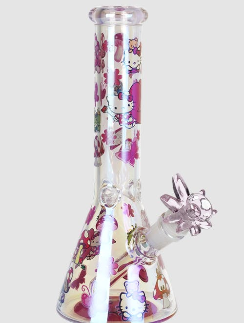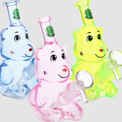 Highlights 5 inches tall Novelty water pipe Happy cartoon bear shape Fixed downstem Borosilicate glass Includes 14mm male herb slide w/ handle Colors vary The SeshGear Happy Bears Glass Water Pipe measures 5 inches (12.7cm) tall and is made of quality borosilicate glass. The pipe has a fixed downstem and crafted in the shape of a cartoon bear with large eyes and a friendly smile. Includes a 14mm male funnel style herb slide with a rod handle. Colors vary.