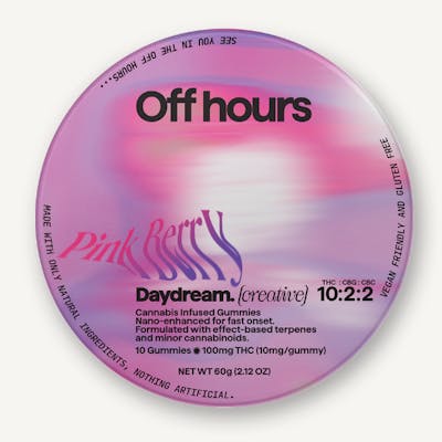 Off Hours lifts your mood with their Day Dream Pink Berry gummies, a juicy, tropical-inspired edible formulated for light, creative energy. Each gummy is infused with a 10:2:2 blend of THC, CBG, and CBC—crafted for daytime clarity and mood elevation without overdoing it.