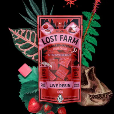 A pungent, earthy, and sour cross between Sour Dubb, Chem's Sister, and Chocolate Diesel, this Hybrid strain is known for its full-bodied and flavorful notes of chocolate, coffee, and diesel. Juicy, bright strawberry notes are equally paired with the savory, full-bodied flavors distinct to the GG4 strain. Lost Farm isn't a place, it's a conviction- a belief that propels rare seekers onto unknown paths on an endless drive for perfection. For Kiva, it's a vision that the perfect strain and the ideal edible lies just within reach. Lost Farm immortalizes the intoxicating allure of a fresh cannabis plant at harvest and transforms it into an amber nectar known as 'live resin.' Harmoniously combined with fruit flavors that enhance each singular strain's unique appeal, the result is a full-sensory, ultra-fresh, and extra-strength gummy. Though perfection may seem near, remember that true victory lies in finding what is lost, not in keeping it. May the search continue.