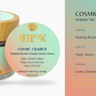 Cosmic Crasher Hybrid/Classic Lineage: Wedding Breath x Purple Punch x Oreoz Aromas: Earthy, Chestnut, Buttery Effects: Tingly, Snoozy, Ravenous