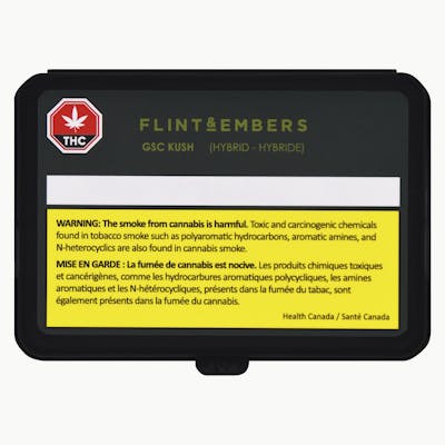 Flint & Embers’ GSC Kush (GSC x Conspiracy Kush) is a full-flavoured hybrid. Robust and refined, this cultivar immerses you in sweet notes of savoury chocolate and coffee with lingering aromas of crushed pepper. Naturally grown in microclimate conditions inspired by the unique environments each plant thrives in - GSC Kush pre-rolls are single strain, whole bud, milled to perfection and evenly rolled with 100% eco-friendly papers. Every pack of pre-rolls comes in a reusable kit with a humidity pack that locks in freshness for joints that are ready when you are.