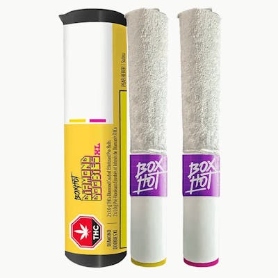Go big or go home with the BOXHOT Pear Herer + Strawberry Diesel Diamond Doobies XL mixer pack. Get double the size and double the choice with this 2-pack of our iced-out and infused, potent pre-rolls in a girthy 1.0g format. Square up for a sativa double whammy with the Pear Herer ripe rebel that blaze the way with a juicy pear-apple blend and the well-balanced Strawberry Diesel clouds of strawberry and gas. Each thick blitz is infused with terp-boosted liquid diamonds and coated in crushed diamonds to deliver a massive load of THC, levelled up with premium ceramic filters with colour-coded seals to burn smooth all sesh long.