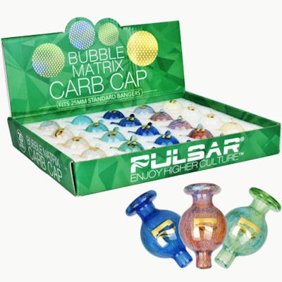 These Pulsar Bubble Matrix Bubble Carb Caps are great for use with angle cut or flat top quartz bangers. The caps allow you to direct the airflow where you want it and can be used for spinning terp pearls. Measures 26mm in diameter at the widest point and fits standard 25mm banger openings or smaller. Sold as a 20-piece display. Highlights: 20-piece display 26mm diameter Ball (bubble) style carb cap Borosilicate glass Directional airflow Bubble matrix design Assorted colors