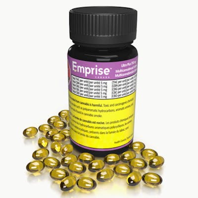 750 mg total Multicannabinoid per bottle Emprise’s Ultra Plus 750 mg Multicannabinoid Softgels contains 30 softgels. Each softgel has 5 mg THC:CBN:CBG:CBC:CBD. The product is formulated with THC, CBN, CBG, CBC, and CBD distillates & Isolates for a consistent Multicannabinoid profile in a hemp seed carrier oil which supports the Entourage effect. Making this product the first true-to-plant softgel on the market - After all if it grows together, it goes together.