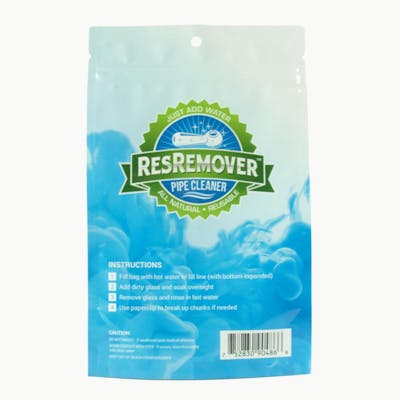 ResRemover 420 Cleaner is the first "Just Add Water" pipe cleaner! Simply add hot water to the bag, add your dirty smoking accessories, and soak overnight. All-natural plant based formula is safe on the environment, no more alcohol or other harsh solvents! Since ResRemover is water-based it rinses completely clean after use, there's no bad tastes, smells, or residues from other traditional cleaning chemicals. Say goodbye to isopropyl alcohol and other harsh solvents, salts, and abrasives. No agitation required. The cleaning pouch can be stored by closing the zip seal top and storing with other household cleaners. Safe on glass, quartz, acrylic, plastic, silicone, metal, ceramic. To use: Fill with HOT water to the fill line, add dirty items, squeeze out air to raise water level if needed and zip seal the bag, soak overnight. After soaking rinse under hot water Seal bag for reuse if desired. *Pro tip* For larger items which don't fit in the bag, soak stems and bowls following directions above, then pour remaining contents of bag into larger glass from the top and let soak.