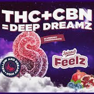 Relax and drift away with Spinach FEELZ™ Deep Dreamz THC+CBN gummies. These delicious blueberry pomegranate gummies are ideal for a mellow and dreamy high, thanks to our special blend of THC and rare cannabinoid, CBN. Kick back and float on by with Spinach FEELZ™ Deep Dreamz THC+CBN gummies. Two sour-then-sweet gummies, with 10mg of THC and 5mg CBN Totals per pack. Feelz. The Way You Want.