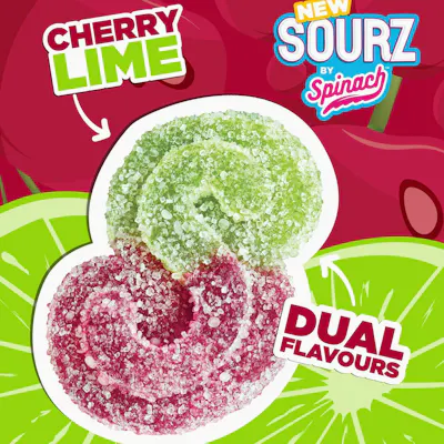 Prepare for blast off! SOURZ by Spinach® Fully Blasted Cherry Lime gummies are action-packed with 5mg THC per piece. Take your taste buds to a world of flavours with delightful cherry and tangy lime. This dual-flavoured gummy is over-the-top with natural flavours and blasted with sour crystals. Enjoy 2 gummies per pack, 10 mg THC total.
