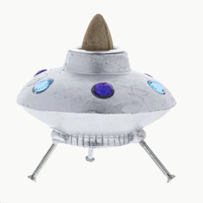 Transform your space with these flying saucer-inspired Spaceship Backflow Burners. Featuring a simple yet sturdy design, simply place your favourite backflow incense at the top of this burner and watch as it flows down and comes out of the bottom, gently streaming as though this spaceship was softly flying through space. Each burner comes with black felt circle to display your spaceship on which doubles as both a grip pad to keep your burner in place and also to catch the smoke as it falls. This burner comes ready for use with one backflow incense cone for use, but if you're hungry for more you can browse our collection of scented backflow cones. Backflow Burner Features: 2" polyresin incense burner Works with backflow cones Smoke cascades downwards Includes (1) incense cone