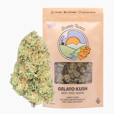 EARTHY • SPICED • RELAXING Earthy spice and a peppery kick lead the way in Gelato Kush, a rare indica we discovered in our pheno hunt with Humboldt Seed Company. Grown in living soil here at Burr’s Place, it delivers a smooth, body-heavy high that relaxes without clouding the mind. Sun-grown, hand-trimmed, and slow-cured on the farm — it’s a deep, calming smoke built for steady, unhurried sessions. PRIMARY TERPENES: Limonene, Caryophyllene, Humulene LINEAGE: Blueberry Biscotti x Pheno Hunt BREEDER: Burr's Place x Humboldt Seed Company