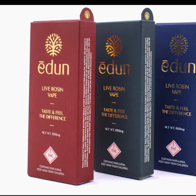 Sativa Dominant Experience the full flavor of super natural terpenes delivered in a solventless and uncut vape cartridge. Our state of the art cartridges are filled with a full flavor, smooth and potent live rosin, made using only flower grown in EDUN's super natural garden. These carts are the perfect way to enjoy terpenes discreetly on the go! EDUN super natural flower is Beyond Organic, Sustainable and Regenerative, all grown and produced with LOVE. Taste and feel the EDUN difference! ***PLEASE INFORM YOUR BUD-TENDERS AND CUSTOMERS THAT ALL LIVE ROSIN VAPES SHOULD BE SMOKED ON LOW VOLTAGE SETTING (3.0v or less) FOR BEST FLAVOR & EXPERIENCE*** Always Single Source • 1st Press Only ***PLEASE INFORM YOUR BUD-TENDERS AND CUSTOMERS THAT ALL LIVE ROSIN VAPES SHOULD BE SMOKED ON LOW VOLTAGE SETTING (3.0v or less) FOR BEST FLAVOR & EXPERIENCE*** Always Single Source • 1st Press Only