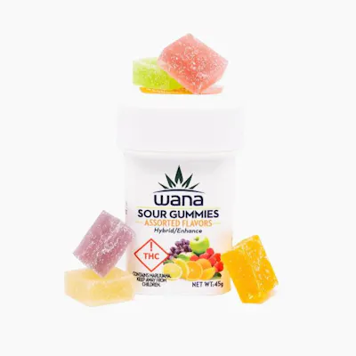 A Wana classic, our assorted hybrid pack comes with a combination of grape, raspberry, lemon, green apple and orange flavors, which taste just like real fruit. Handcrafted with all natural, vegan and gluten free ingredients, the gummies are infused during the cooking process with hybrid terpene-enhanced distillate creating a more balanced experience. (kc) Vegan & Gluten Free 10mg THC per gummy | 100mg per package