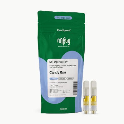 MF-ing Two-Fer: We're now offering two 1/2g carts in one bag. Why? Pouring less oil into each cart means we can preserve more of the plant's full spectrum cannabinoids, remarkable natural terpenes and fuller flavor. Not only that, the Two-Fer is better value and more of our single- source, in-house produced Candy Rain real live resin: Candy Rain is known for its notes of citrus and berries with putrid undertones, which results in a relaxed body high with long lasting invigorating cerebral effects that spread to the whole body. For our real live resin we start with fresh-frozen flower buds, then use the hydrocarbon extraction method (plus years of experience and scientific precision) to deliver the purest plant extract. No distillates, added flavors, or alterations. Comes in a 510 Cart with recommended battery settings 2.8 - 3.3V. Do not vaporize live resin at higher temperatures, as it can “burn off” the precious terpenes and aromas we are working hard to preserve; higher temps can also cause an undesirable “burnt” aftertaste. Vape cartridge contains concentrated live resin oil that is heated by a battery and vaporized for inhalation. These products are very potent and are designed to be consumed in 2-3 second puffs.