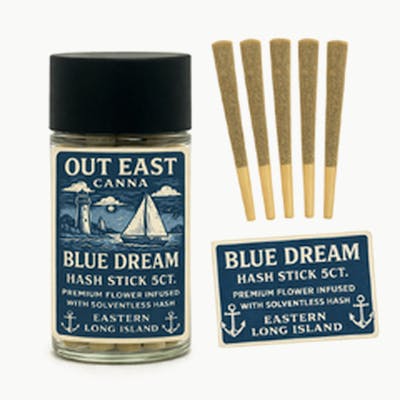 Out East Canna's Blue Dream is a sativa-dominant classic, delivering a balanced, uplifting experience with a clean, even burn. Hash Infused for the highest experience. Perfect for daytime or anytime enjoyment. Crafted and perfected by Peconic Growers.