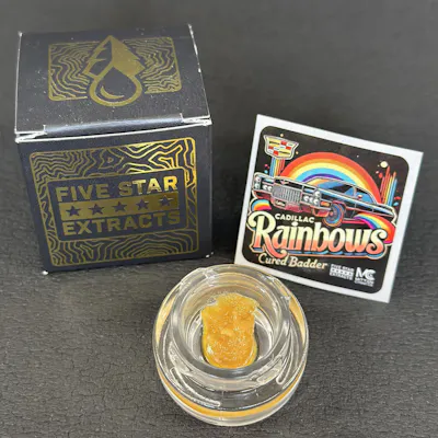 Cadillac Rainbows Cured Badder - Grown by Mitten Canna Co - 75.85% THC - 92.56% Total Cannabinoids - 6.93% Terpenes Cadillac Rainbows is a cross of Runtz x Pure Michigan bred by 3rd Coast Genetics. The terpenes and flavonoids you will experience with this concentrate is extra foul and funky, overwhelming cat piss aroma with a subtle creaminess. As always with all of our concentrates, Five Star Extracts uses no Color Remediation or CRC techniques so you get to experience the true terpenes and flavors the cannabis plant naturally produced. Top 3 Terps in Cadillac Rainbows Cured Badder Limonene - 1.79% - 17.98 mg/g Myrcene - 1.12% - 11.26 mg/g Caryophyllene - 0.92% - 9.27 mg/g