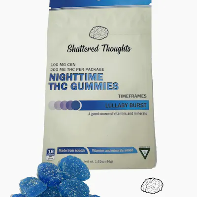 Shattered Thoughts Nighttime Gummies serve up sleep with 20mg THC and 10mg CBN in each piece (10 pieces/pack). While THC has some sedative properties alone, when combined with CBN these effects are amplified to help you fall asleep faster and stay asleep longer. Each pack is crafted using our proprietary recipe and fortified with vitamins and minerals. All nutrition facts are available on the back of each pack.