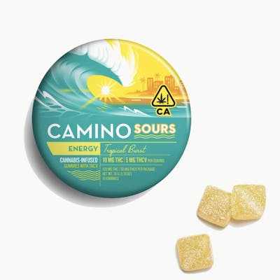 THCV is your energy-boosting ally, potentially enhancing metabolism and curbing appetite. It ensures a clear-headed journey ahead.Vitamin B6 is a prominent player in the body’s energy-production process to give your body the fuel it needs for physical activity.Vitamin B12 helps keep your body’s blood and nerve cells happy. Caffeine, the world’s most popular stimulant, is renowned for its mood-enhancing properties. We add just enough to support increased alertness and a reduction in fatigue, providing a pep in your step equivalent to half a cup of iced tea.Whether you're about to embark on a thrilling adventure, or simply need a boost to seize the day, Tropical Burst Energy Camino Sours are your go-to choice for an invigorating experience that propels you forward with newfound vitality. Terpenes: Alpha-Pinene, Beta-caryophyllene, Limonene, Valencene