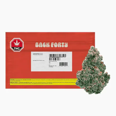 Back Forty’s latest cultivar – Liquid Imagination. A cross between Blue Zkittles and Jet Fuel Gelato, this potent hybrid boasts rich dark green buds adorned with orange pistils and chock-full of trichomes. With a flavour profile that blends sweetness with a pinch of gas, Liquid Imagination is a real treat for your senses with terpenes dominant in Pinene, Myrcene, and Caryophyllene.