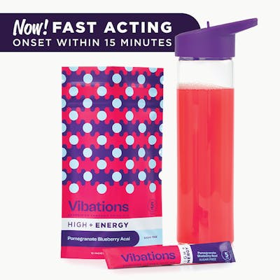 A sip of sublime, sugar-free superfruits. This tasty trio is infused with THC, electrolytes, and natural caffeine from guarana, to put some pomegranate pep in your step. Now! Fast-acting! Vibations: Advanced Hydration for your best day. Hydrate and refresh your day with Vibations cannabis and electrolyte drink mix. Each mix is precision-dosed, all-natural, and infused with full-spectrum cannabis, electrolytes, and natural caffeine from guarana for a boost of focus and energy in every sip.