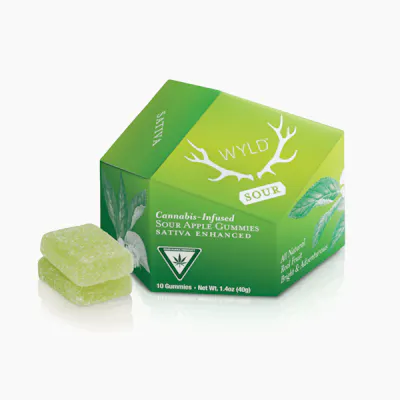 Our Sour Apple Sativa Enhanced Gummies are made with real fruit and enhanced with botanical terpenes to help to create a bright + adventurous experience with a zing. Looking to brighten your mood? It's a little like sparklers on a summer night. Enjoy! 100mg THC per package, 10mg THC per gummy | Serving size: 1/2 gummy Ingredients: Sugar, Tapioca Syrup, Water, Apple Juice Concentrate, Gelatin, Malic Acid, Coconut Oil, Natural Flavoring, Citric Acid, Pectin (Pectin, Sodium Citrate), Cannabis Extract, Fruit juice (color), Turmeric (color), Sunflower Lecithin Contains: Coconut