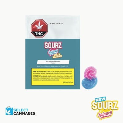 Dive into the wave with SOURZ by Spinach Fully Blasted Blue Raspberry Watermelon gummies! Experience the electrifying blend of vibrant blue raspberry and juicy watermelon flavors that will exhilarate your senses. These dual-flavored soft chews are infused with sour crystals, delivering an intense burst of natural flavors. Each pack contains 1 gummy with a total of 10mg THC, perfect for a refreshing treat.