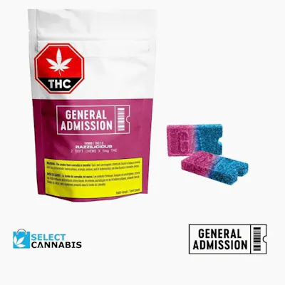 General Admission is all about big bold flavours and our edibles are no different! We're bringing cult classic flavours and new all-stars to our line up in soft chew edible format, giving our fans choice in how to consume their favourites. Because with General Admission, all are welcome. Sour, sweet, with plenty of razz; Razzilicious is being low's worst enemy. Pucker up, this edible hits heavy with sour flavour but comes out sweet on the finish. Razz up your homies with Razzilicious.