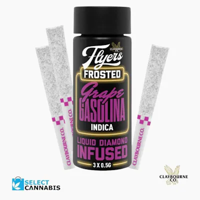 Claybourne Frosted Flyers Infused Grape Gasolina pre-rolls are THCa diamond frosted, terpene enhanced and infused with liquid diamonds. These 3x0.5g pre-rolls are indica-dominant and boast 40-50% THC. Looking for bold flavour and a potent experience? Look no further than Claybourne Frosted Flyers.