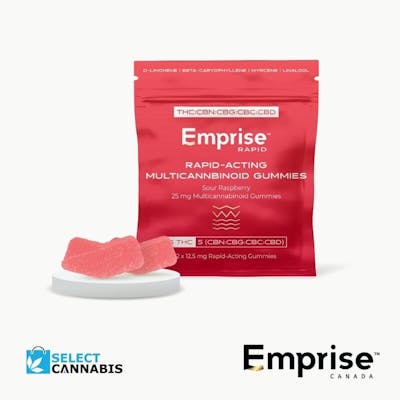 Emprise's Rapid Onset Sour Raspberry 25 mg Multicannabinoid Gummies is a THC:CBN:CBG:CBC:CBD formulation that is active in 8-12 minutes using Emprise's Advanced Nano THC Technology. Each Gummy delivers a potent 2.5 mg THC:CBN:CBG:CBC:CBD each. The product is formulated with Full Spectrum Cannabis Extracts, Delicious Sour Raspberry flavour with a Sativa:Indica terpene profile. Vegan, Natural, Rapid Onset. Each Package contains 2 x 2.5mg THC:CBN:CBG:CBC:CBD Gummies. Terpenes: d-limonene, beta-caryophyllene, Myrcene, Linalool.