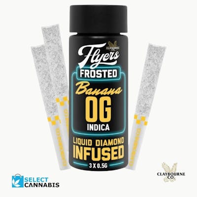 Claybourne Frosted Flyers Infused Banana OG pre-rolls are THCa diamond frosted, terpene enhanced and infused with liquid diamonds. These 3x0.5g pre-rolls are indica-dominant and boast 40-50% THC. Looking for bold flavour and a potent experience? Look no further than Claybourne Frosted Flyers.