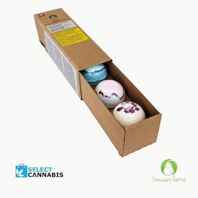 A triple box featuring three uniquely scented, handcrafted and ultra-moisturizing bath bombs with 50mg CBD and 50mg THC per fizzy sphere. Each bath bomb has been inspired by an iconic cannabis strain: Blue dream is restorative and soothing, featuring Lemongrass, Frankincense and Black Pepper. Bubba Kush is just as sedating as its namesake with soothing Lavender, Grapefruit and Ylang Ylang essential oils. Chocolate Hashberry will get you in the mood with sweet notes of cocoa butter nestled amongst an aromatic blend of Palmarosa, Orange and Chamomile. Stewart Farms bath bombs are hand-pressed with care and are 100% plant-based, designed without the use of synthetic perfumes, fragrances or alcohols, and packaged in biodegradable materials.