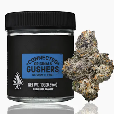 Connected Gushers 3.5g is a top-shelf indica-dominant hybrid that blends nostalgic candy flavor with powerful OG effects. Bred from Gelato #41 × Triangle Kush, this indoor-grown strain features dense, frosty buds packed with tropical syrup, creamy gas, and earthy undertones—like an exotic dessert with a potent kick. Hand-trimmed and cultivated under precise conditions, each jar delivers terpene-rich flower with standout notes from limonene, caryophyllene, and linalool, offering citrus zest, spicy depth, and a floral finish. Gushers provides a mellow euphoric lift that eases into smooth, creeping body relaxation—ideal for afternoon chill, low-key socializing, or vibing out with sweet, aromatic bliss.