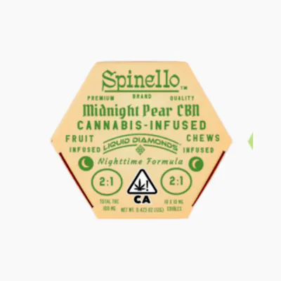 Spinello Midnight Pear Fruit Chew 2:1 100mg offers a smooth blend of juicy pear flavor with a calming dose of cannabinoids designed for relaxation and balance. Each pack contains 10 chews, with 10mg CBD and 5mg THC per piece, totaling 100mg CBD and 50mg THC. The 2:1 ratio is ideal for those seeking mild euphoria with enhanced body relaxation and stress relief. Made with all-natural ingredients, these vegan and gluten-free chews deliver clean flavor without artificial additives. Spinello’s Midnight Pear is a perfect choice for evening wind-down or anytime you need a gentle, balanced high.