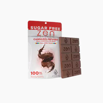 Satisfy your sweet tooth without the sugar with ZEN | Sugar Free Chocolate | 100mg. This smooth, creamy milk chocolate bar is perfect for anyone looking to enjoy cannabis in a more mindful way. Each bar is infused with 100mg of THC and broken into ten easy 10mg doses, so you can control your experience one square at a time. Whether you're avoiding sugar for dietary reasons or just want a lighter edible that still hits the spot, Zen’s sugar-free chocolate delivers rich flavor and a mellow, full-spectrum high. Ideal for relaxing evenings or winding down after a long day—no sugar crash included.