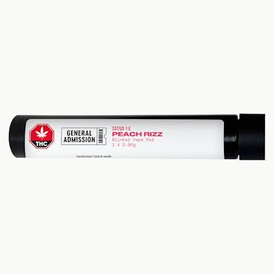 Made for the masses, General Admission vapes are all about flavour. General Admission uses the power of taste to encourage moments of discovery. We create quality THC distillate infused with botanical terpenes that complement the natural aromas of our strain selection. Peach Rizz is a sticky, sweet and all-around sour burst of that classic slice of peach. Floral notes round out the sugary profile of this favourite strain, known for being exceptionally smooth and potent.