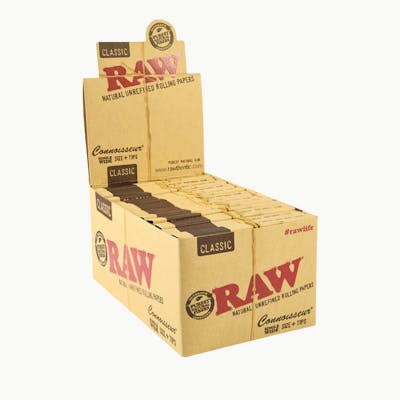 RAW Classic Connoisseur Single Wide Rolling Papers and Tips offer the ultimate in convenience and quality. Each Connoisseur pack includes RAW's signature unrefined, naturally unbleached papers alongside unrefined tips, all housed in a unique outer sleeve with a natural rubber band for easy portability. Made with an Acacia gumline and featuring RAW's patented criss-cross watermark, these papers provide an even, smooth burn every time.