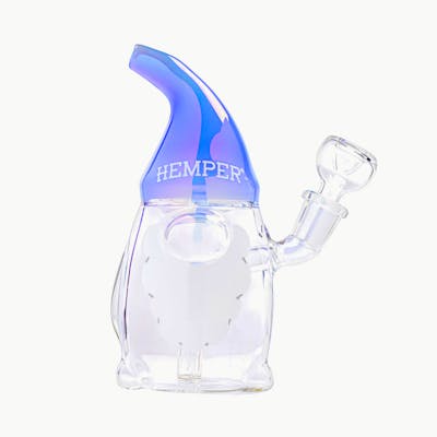Meet the life of the party, the 6.5" Hemper Trippy Gnome Bong! This gnome-shaped glass piece is adorned with a dazzling blue iridescent hat and a fluffy white beard decal, ready to elevate your smoke sessions with psychedelic vibes. With the bowl nestled conveniently in one of his arms, this gnome isn't just for show – he's your trusty smoking sidekick, delivering smooth hits with a diffused downstem.