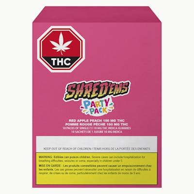SHRED’ems Red Apple Peach Party Pack has 10 packs of MAX10 gummies, each with 10mg THC for a total 100MG THC PER PACK! These juicy indica gummies blend the crisp sweetness of red apple with the smooth, mellow flavour of ripe juicy peach.