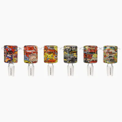 The 14mm Arsenal Cartoon Chaos Glass Bowl is all about bold, full-wrap artwork packed with colorful, expressive characters that make each piece feel a little different. It’s fun, a bit chaotic, and definitely stands out on any setup without being overcomplicated to use. The compact bucket shape makes it easy to pack, while the airflow stays smooth and consistent for clean pulls. Made from durable glass and built for standard 14mm joints, it’s a simple, reliable bowl with way more personality than usual.