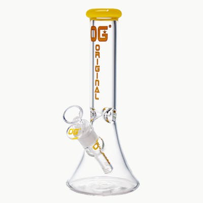 Built from 5mm thick borosilicate, this 10 inch beaker has a solid, balanced feel and the kind of durability you want in a regular-use piece. The clear body lets you see the function in action, while the OG logo and colored rim add just enough style without overdoing it. The beaker base keeps it stable, the airflow stays smooth, and it is easy to clean when the session’s over. Comes ready with a matching downstem and 14mm bowl so you are not hunting for parts.