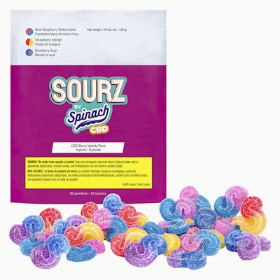 Bite into berry bliss with the SOURZ by Spinach® CBD Berry Variety Pack! With 30 gummies per pack, you bring the vibes — we’ve got the snacks. Enjoy the delicious taste of 3 berry blasted flavours including Blue Raspberry Watermelon, Strawberry Mango, and Blueberry Açai. These dual-flavoured gummies are blasted with sour crystals and over-the-top with natural flavours. Snackable and stackable with 30mg CBD per gummy and 900mg CBD total per pack.